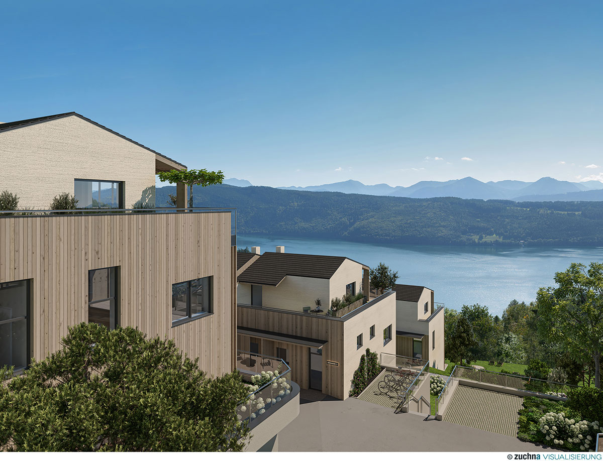 Häuser in Holzbauweise mit kompakter Grundfläche auf drei Ebenen und großer Dachterrasse. Vom Obergeschoß gelangt man über eine Außentreppe auf das Gartendach. Der Wörthersee ist nur fünf Autominuten entfernt.