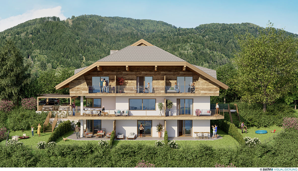 Häuser in Holzbauweise mit hochwertiger Ausstattung auf drei Ebenen und großer Dachterrasse. Das Gartendach wird teilweise als Wintergarten verglast und ist ganzjährig nutzbar. Jedes Haus mit Blick auf den Millstättersee.